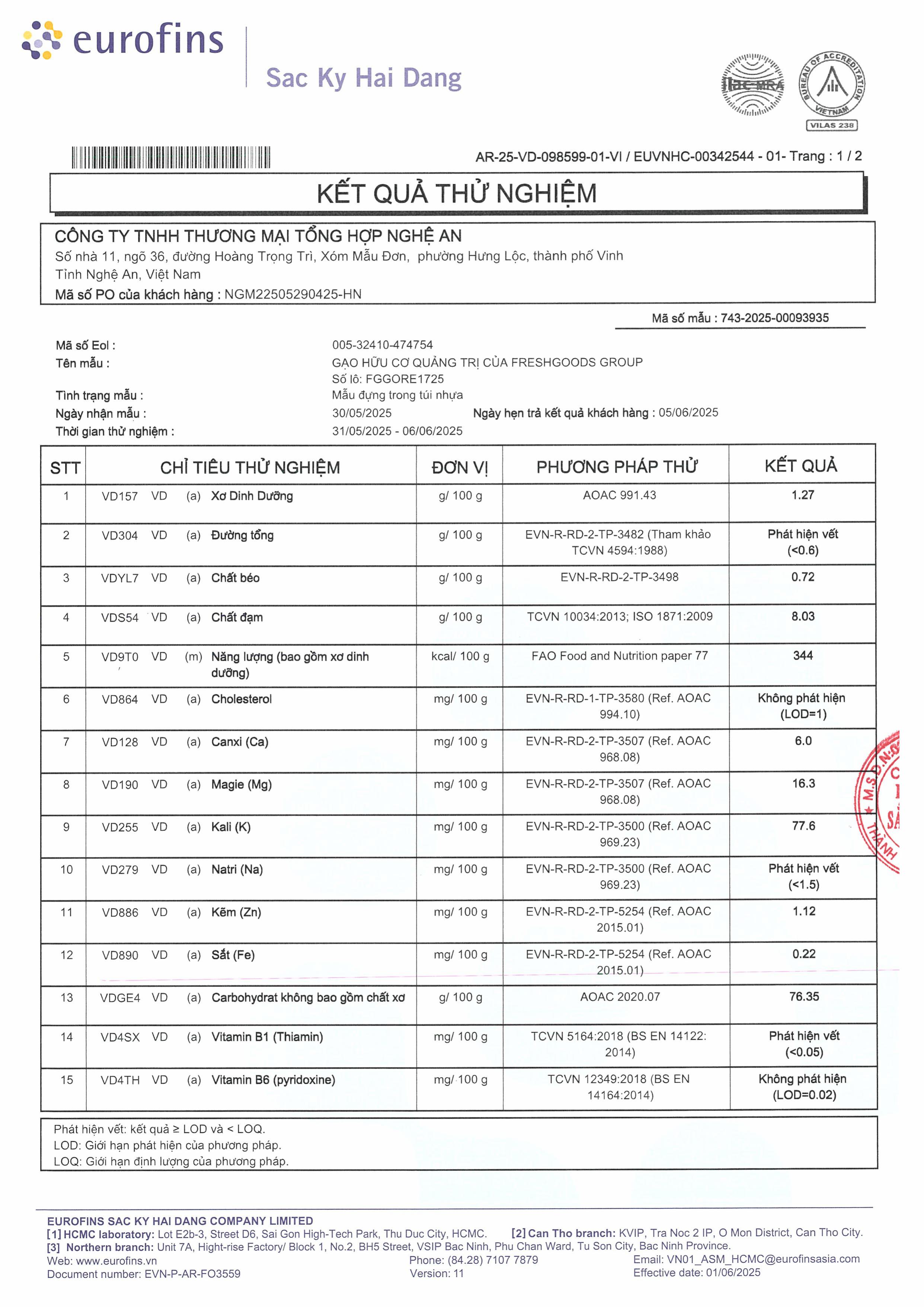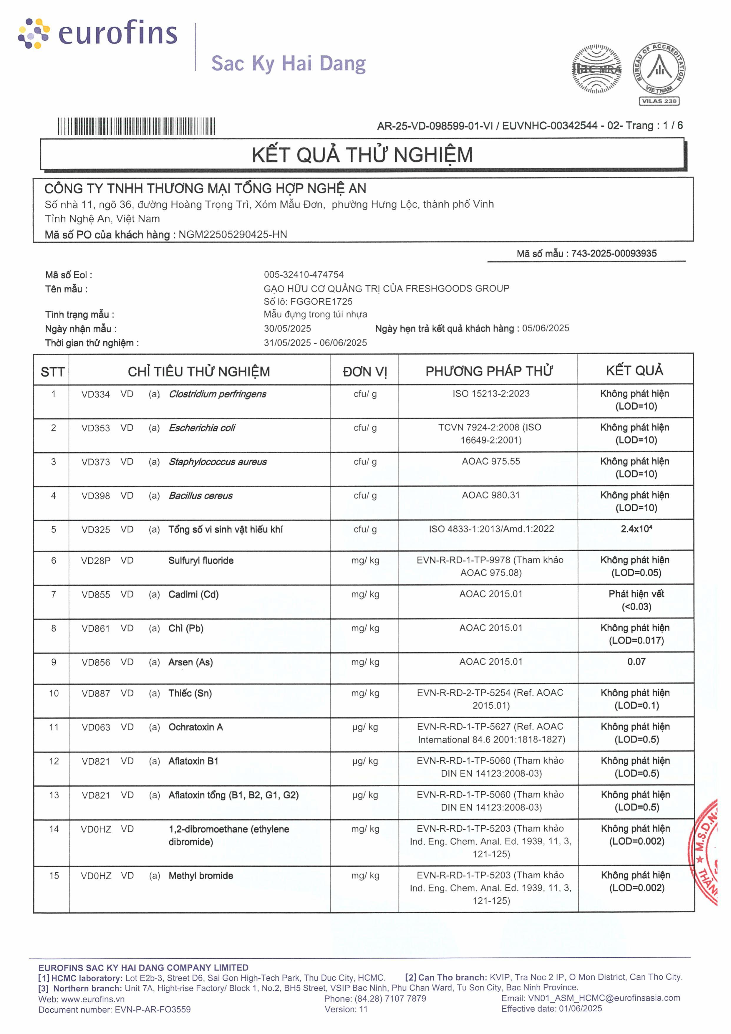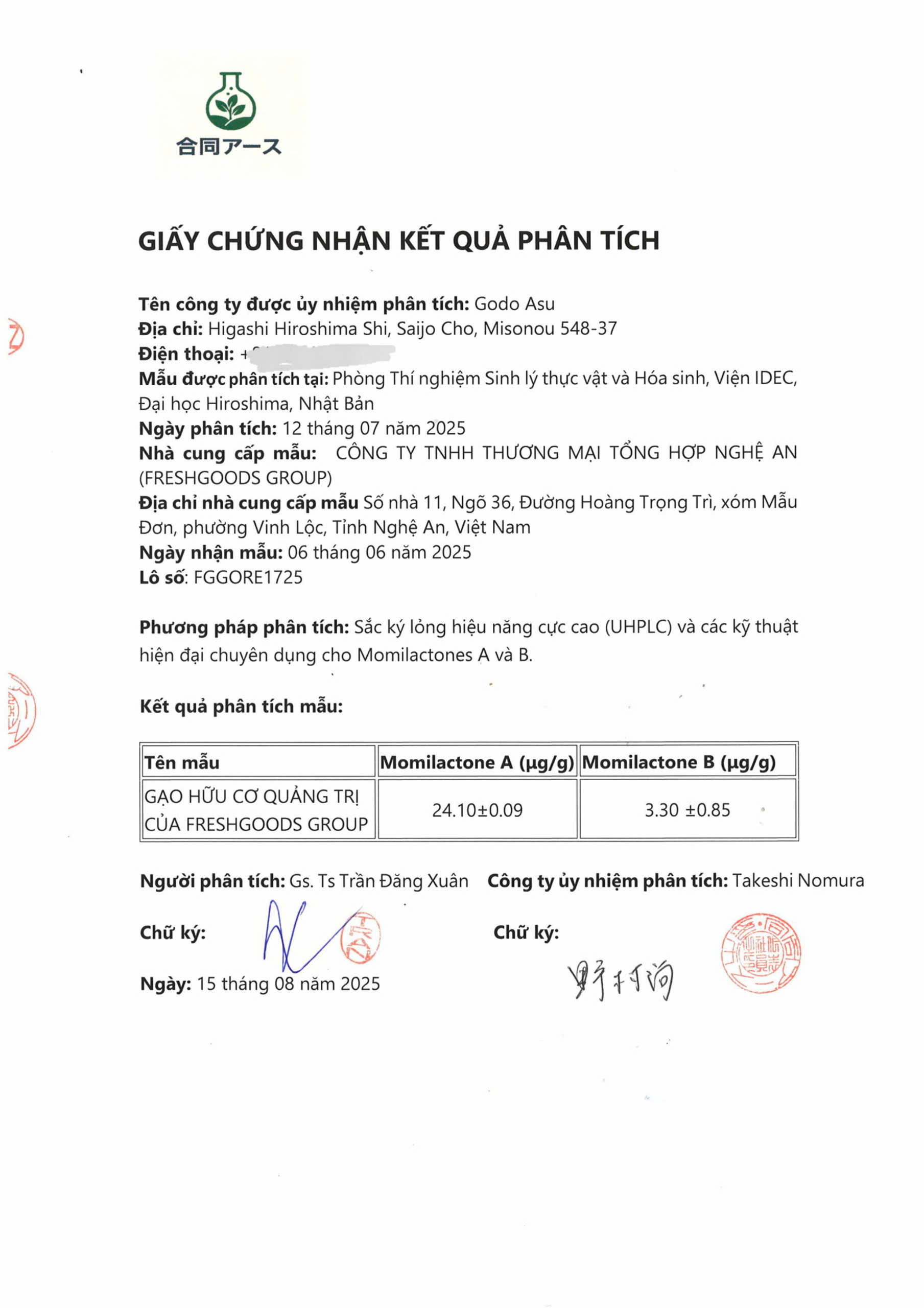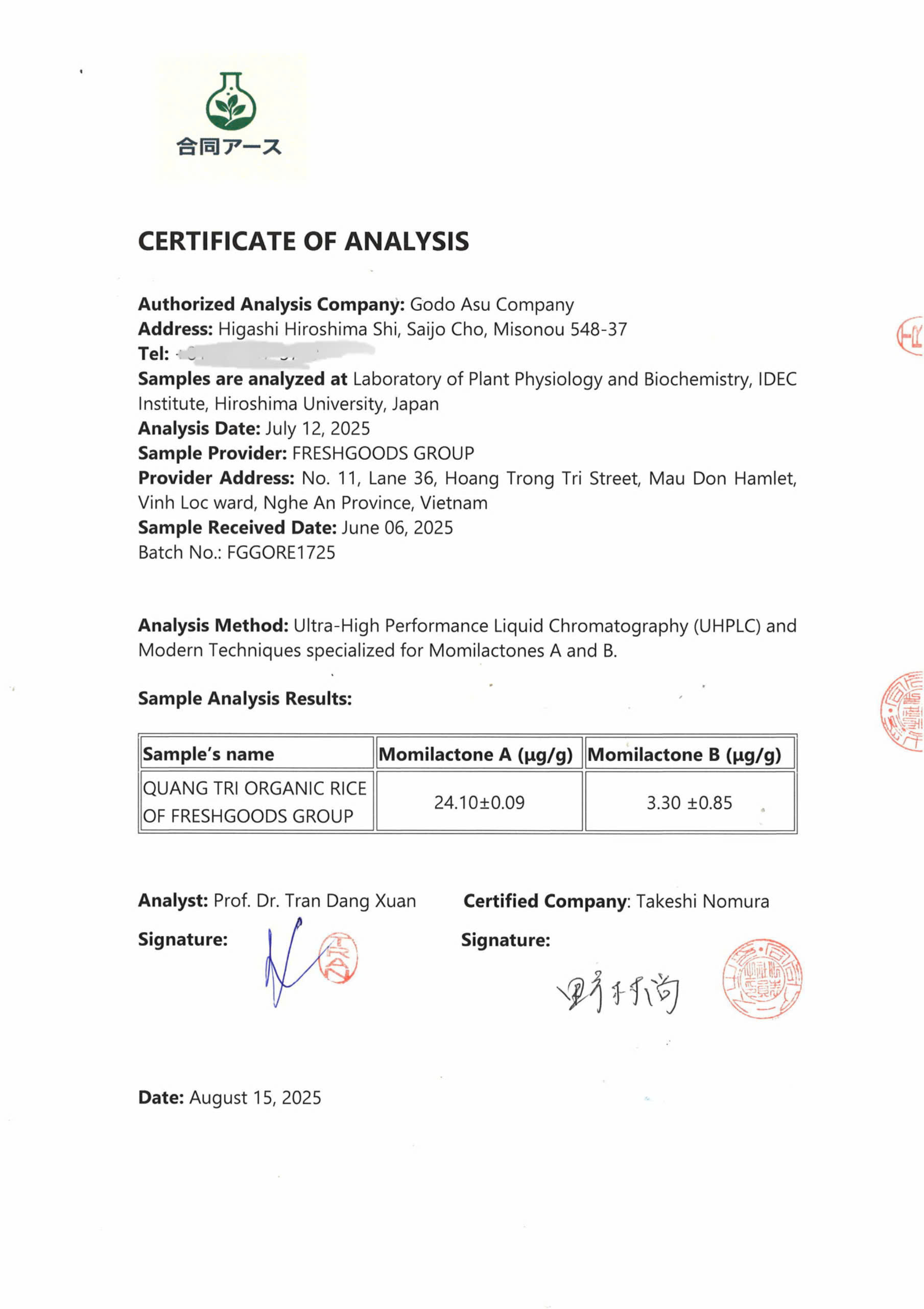 1. Gạo hữu cơ Quảng Trị của Freshgoods Group đặc biệt chứa hàm lượng cao hợp chất Momilactones A (MA) và Momilactones B (MB) (Xin vui lòng xem kết quả phân tích đính kèm).